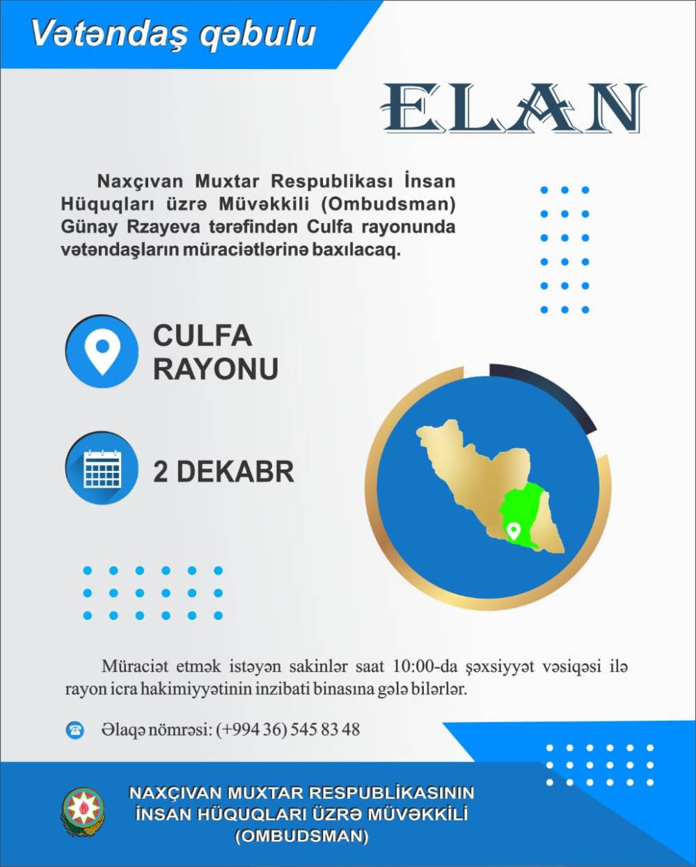 Naxçıvan Muxtar Respublikasının İnsan Hüquqları üzrə Müvəkkili (Ombudsman) Günay Rzayeva 2 dekabr 2025-ci il tarixdə Culfa rayonunda vətəndaşları qəbul edəcək. Culfa rayon sakinləri (+994 36) 545 83 48 nömrəsi ilə əlaqə saxlaya bilərlər. Qeyd edək ki, vətəndaş qəbulu saat 10:00 da Culfa Rayon İcra Hakimiyyətinin İnzibati binasında keçiriləcək....