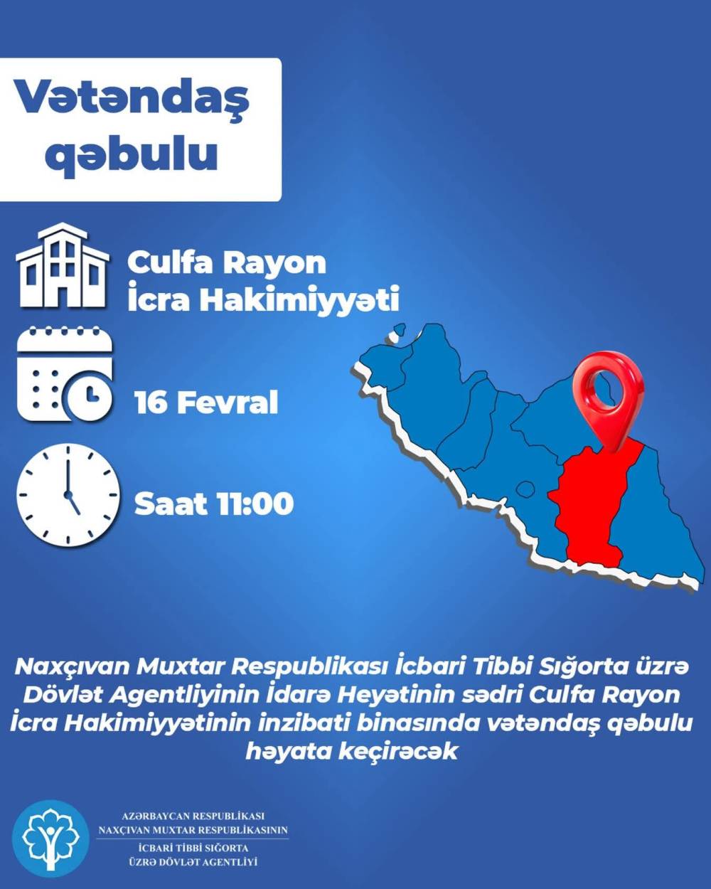 Naxçıvan Muxtar Respublikası İcbari Tibbi Sığorta üzrə Dövlət Agentliyinin İdarə Heyətinin sədri Elnur İbrahimov 16 fevral saat 11:00-da Culfa Rayon İcra Hakimiyyətinin inzibati binasında vətəndaş qəbulu həyata keçirəcəkdir....