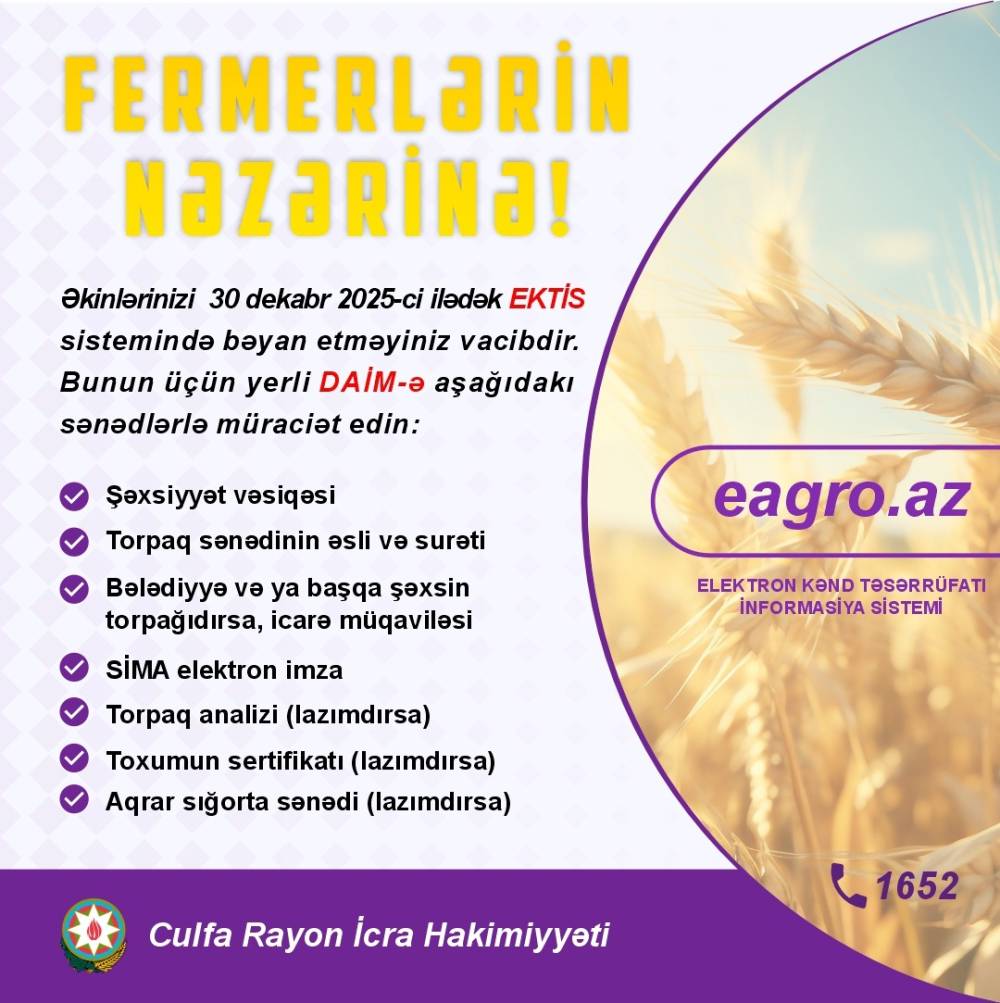 Əkinlərinizi 30 dekabr 2025-dək EKTİS sistemində bəyan etməyiniz vacibdir. Bunun üçün yerli DAİM-ə müraciət edib aşağıdakı sənədləri təqdim edin: * Şəxsiyyət vəsiqəsi * Torpaq sənədi (əsli və ya surəti) * Əgər torpaq sizə məxsus deyilsə — icarə müqaviləsi * SİMA elektron imza * Tələb olunduğu halda: torpaq analizi, toxum sertifikatı və aqrar sığorta sənədi Bu məlumat fermerlərin məlumatlandırılması məqsədi daşıyır....