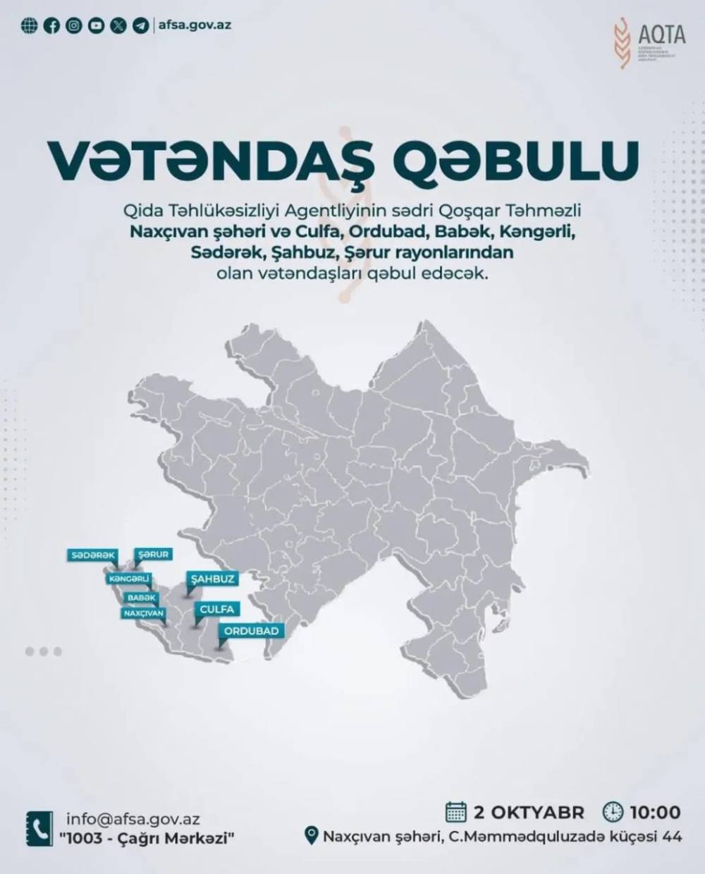 Azərbaycan Qida Təhlükəsizliyi Agentliyinin sədri Qoşqar Təhməzli oktyabrın 2-si saat 10:00-da Naxçıvan şəhəri, C.Məmmədquluzadə küçəsi 44 ünvanında Naxçıvan şəhəri və Culfa, Ordubad, Babək, Kəngərli, Sədərək, Şahbuz, Şərur rayonlarından olan vətəndaşların qəbulunu keçirəcək. Vətəndaşlar ad, soyad, ata adı, müraciətin məzmunu, yaşayış ünvanı və telefon nömrəsini göstərməklə info@afsa.gov.az elektron ünvanına rəsmi şəkildə müraciət edərək və ya “1003-Çağrı Mərkəzi” ilə əlaqə s...