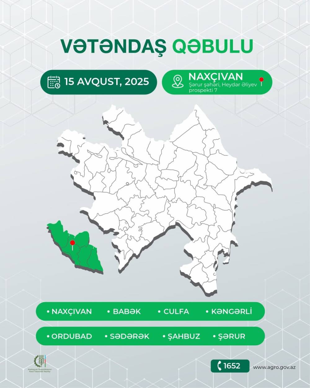 Azərbaycan Respublikasının kənd təsərrüfatı naziri Məcnun Məmmədov avqust ayının 15-də saat 09:00-da Şərur Rayon İcra Hakimiyyətinin inzibati binasında Naxçıvan şəhəri, Babək, Culfa, Kəngərli, Ordubad, Sədərək və Şahbuz rayonlarından olan vətəndaşları qəbul edəcək. Qəbul zamanı vətəndaşların Kənd Təsərrüfatı Nazirliyinin səlahiyyət dairəsinə aid məsələlərlə bağlı müraciətləri cavablandırılacaq, müraciətlərdə əksini tapan məsələlərin həlli ilə əlaqədar tədbirlər görüləcək. Qəb...